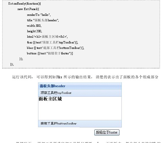 </script> <input id="btnAlert" type="button" value=""/> Ext .get("btnAlert")得到一个与页面中按钮btnAlert关联的Ext .Element 对象,可以直接调 用该对象上的addListener 方法来给对象添加事件 ExtonReady(function(){ var win=new Ext.Window({,,}); win.on("beforeDestory",function(obj){ obj.show(); return false;}); win.show();}); 与ExtonReady(function(){ var win=new Ext.Window({,,,listeners:{"beforeDestory";function(obj) obj.show(); return false;}); win.show();}); 功能一样Panel 面板Panel 是ExtJS 控件的基础,很高级控件都是在面板的基础上扩展的,还有其它大 多数控件也都直接或间接有关系。应用程序的界面一般情况下是由一个一个的面板通过同不组织方式形成。 面板由以下几个部分组成,一个顶部工具栏、一个底部工具栏、面板头部、面板尾部、 面板主区域几个部分组件。面板类中还内置了面板展开、关闭等功能,并提供一系列可重用的工具按钮使得我们可以轻松实现自定义的行为,面板可以放入其它任何容器中,面本板身是一个容器,他里面又可以包含各种其它组件。 fbar为顶部工具栏 bbar为底部工具栏 工具栏 面板中可以有工具栏,工具栏可以位于面板顶部或底部,Ex t 中工具栏是由Ext .Toolbar 类表示。工具栏上可以存放按钮、文本、分隔符等内容。面板对象中内置了很多实用的具工 栏,可以直接通过面板的tools配置选项往面板头部加入预定义的工具栏选项。 可以声明 tools;[{id:"save"},{id:"help",handler:function(){Ext.Msg.alert("");},{id:"close"}} 或者: tbar:[ new Ext.Tool bar.TextItem(工'具栏:'), {presse d:true ,text:'添加'}, {pressed:true ,text:'保存'} ]选项面板的TabPanel Viewport不需要再指定renderTo,而我们也看到Viewport确实填充了整个浏览器显示区域,并会随着浏览器显示区域大小的改变而改改。Viewport主要用于应用程序的主界面,可以通过使用不同的布局来搭建出不同风格应的 用程序主界面。在Viewport上常用的布局有fit、border 等