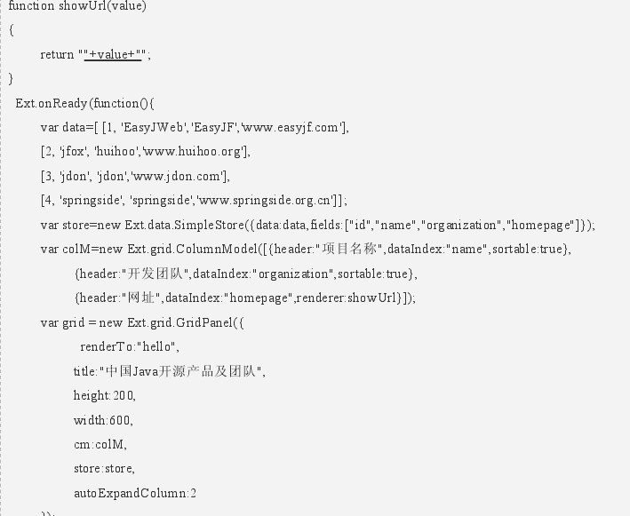 表格Grid 必须包含列定义信息,并指定表格的数据存储器Ext.data.Store定义