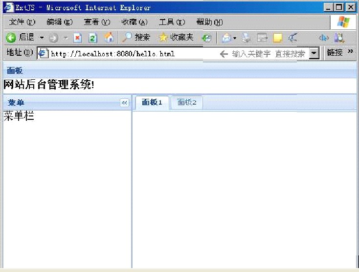 Title ExtonReady(function(){ new Ext.Viewport({ enablesTabScroll:true, layout:"border", items:[{ title:"面板", region: "north", height:50, html:"<h1>网站后台管理系统</h1>" }, {title:"菜单", region:"west", width:200; collapsible:true; html:"菜单栏" }, {xtype:"tabpanel", region:"center", items;[{title:"面板1"}, {title:"面板2"}] } ] }); });运行结果: