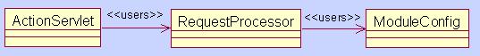 客户端发送一个Request,Servlet负责拦截所有的请求,并决定分发每一个请求。对应的类是ActionServlet,可以说ActionServlet是一个Controller。ActionServlet是怎样分发每一个请求的呢?首先,读取strtuts-config.xml配置文件里的信息,找到每一个Action,Action负责和业务逻辑打交道,也就是Model。最后,通过Servlet来Forward到相应的前端(如html,jsp等)。通常把前端展示部分称为VIEW。 Struts有三个核心的类,分别是ActionServlet,ModuleConfig,RequestProcessor。ActionServlet就是控制器,ModuleConfig封装着Struts应用程序的配置信息,RequestProcessor负责处理每一个HTTP请求。 它们之间的依赖关系如图所示: