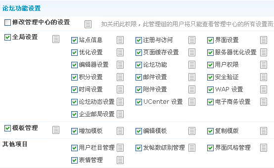 “管理中心权限”是管理员和信息检查员组别特有的权限,站长可以通过后台设置,控制每个管理员组所拥有的后台操作权限。