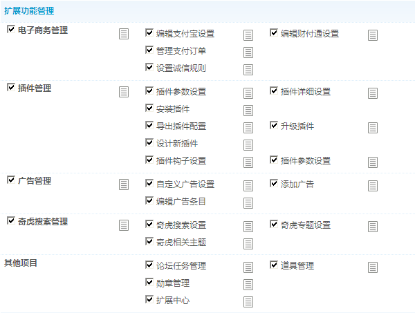 4、扩展功能管理可以设置该管理组对后台扩展功能的操作权限;