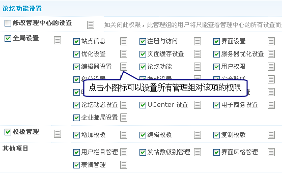 2、论坛资源设置可以设置该管理组对用户,版块及主题分类/分类信息的管理权限;
