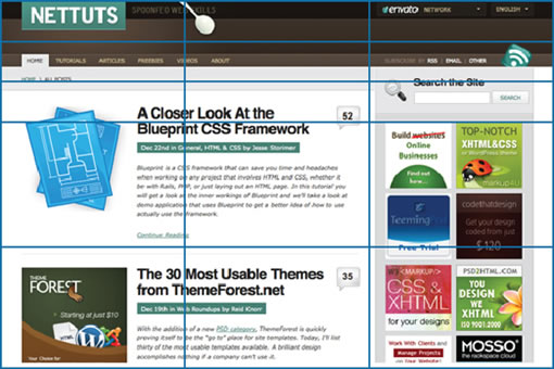 正如你看到的,NetTuts很好的遵循了黄金比率。顶端三分之一的网页再次分成了三分,非常接近黄金比率。难怪NetTuts的设计是如此吸引人!