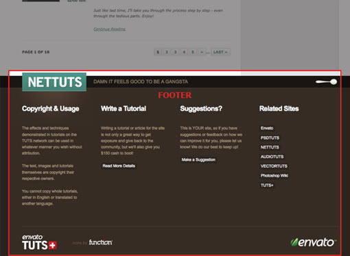 web页面的尾部总会有一个页脚,让您的访客知道他已经到达了你web页面的结束部分。和header一样,footer也不是一个特殊的元素 。在你的页脚里包含版权,法律声明以及主要的联系方式。包含一些重要的链接是个好主意,比如home page, contact page, 等. 有些网站用这个区域提供一些相关材料或者其他重要信息。