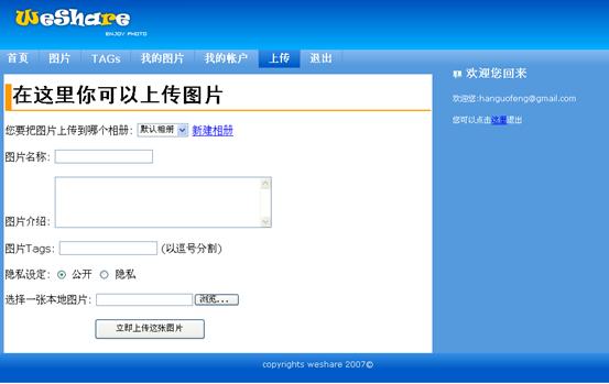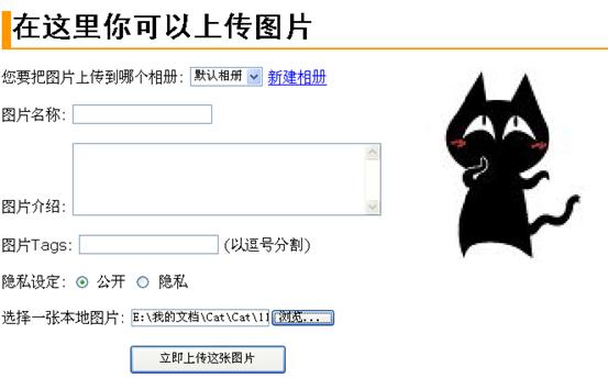 upload.asp文件用于显示供用户上传使用的表单,在这个表单里面,用户可以选择要上传的照片所属的类别,同时可以填写照片名称、介绍、TAG等内容,通过使用表单文件域选择文件,还可以预览所选择的文件。